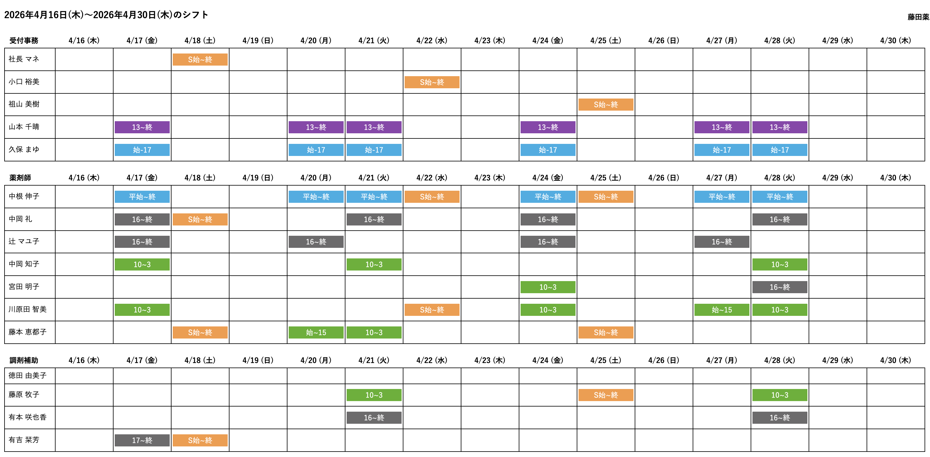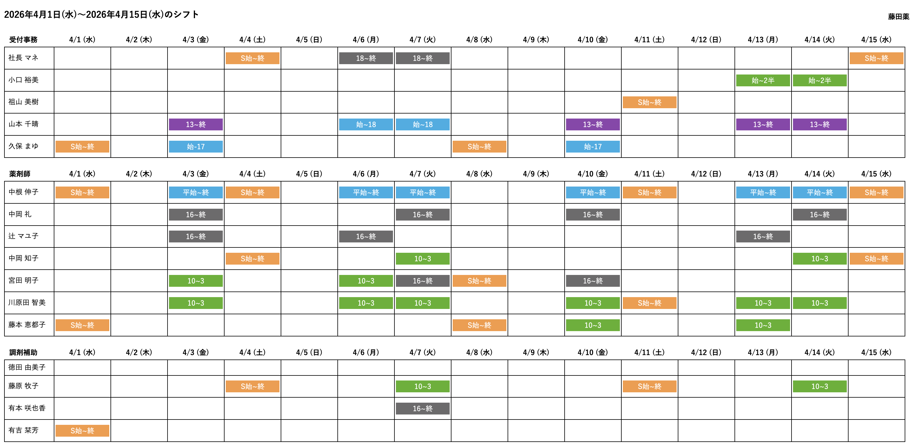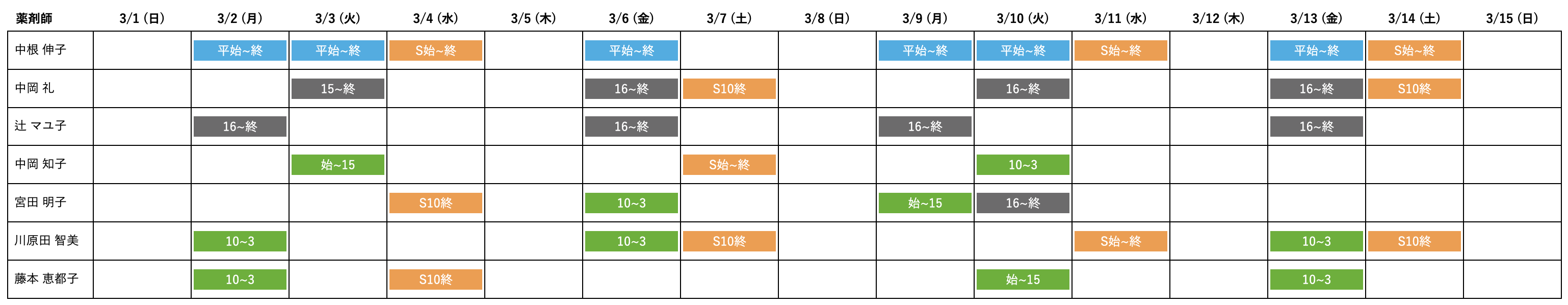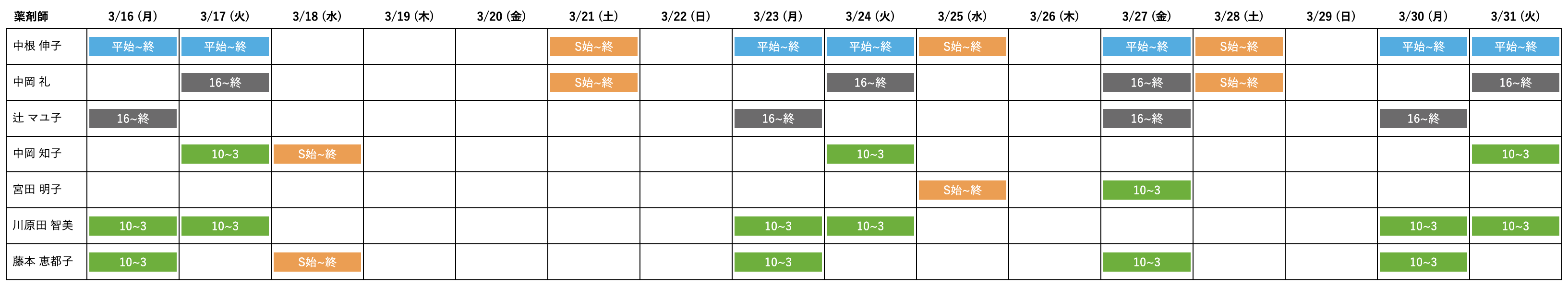 薬剤師勤務シフト表
